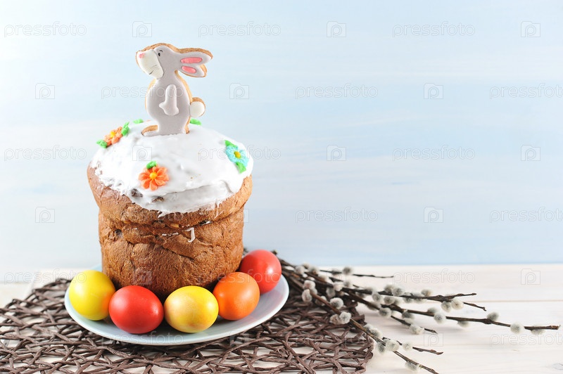 Кулич с фигуркой зайца, расписные пасхальные яйца, веточки вербы