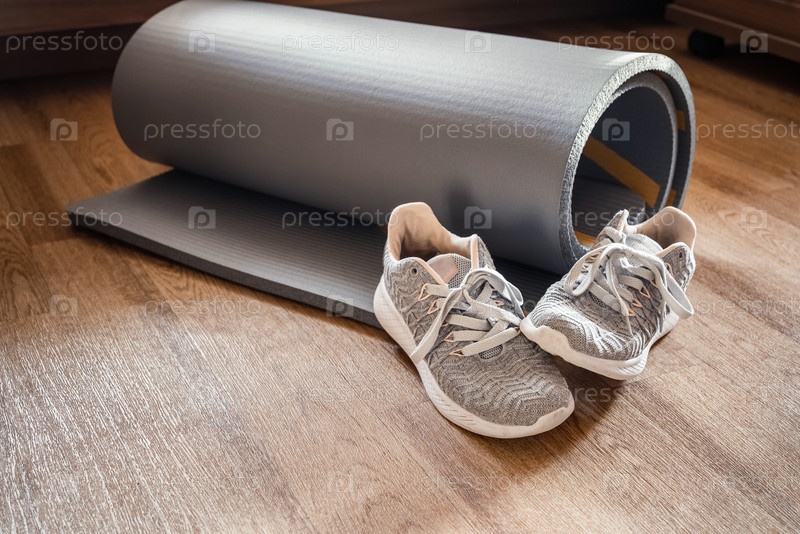 Спортивная обувь стоит рядом с скрученным ковриком для йоги