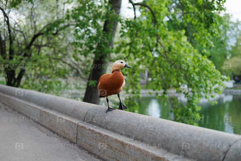 Утка Tadorna ferruginea стоит на берегу пруда