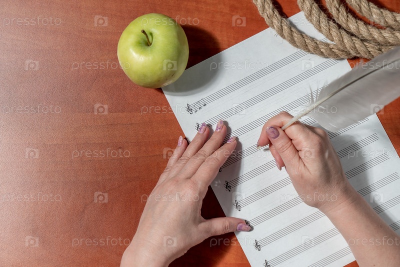 Рукописные ноты и скрипичный ключ. Лист бумаги с нотами. Женские руки на листе с нотным станом. Изучение темы сольфеджио