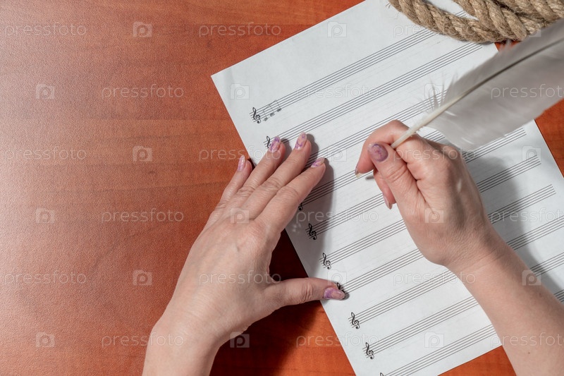 Рукописные ноты и скрипичный ключ. Лист бумаги с нотами. Женские руки на листе с нотным станом. Изучение темы сольфеджио