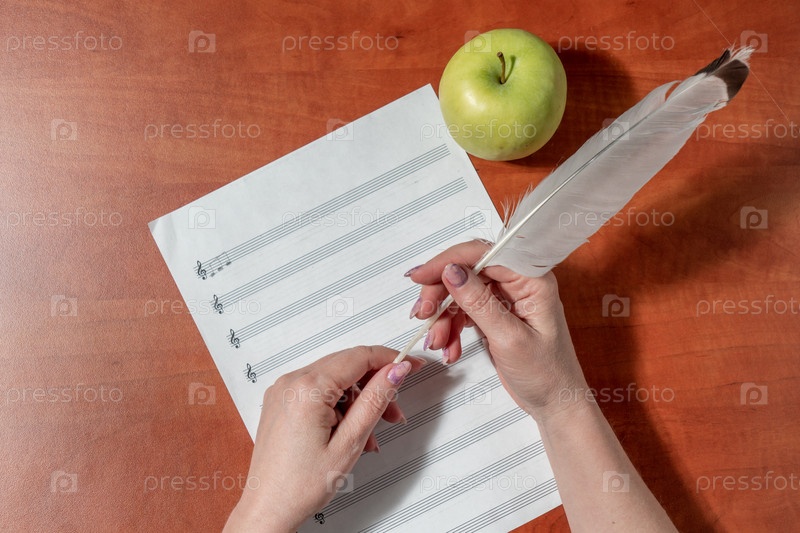 Рукописные ноты и скрипичный ключ. Лист бумаги с нотами. Женские руки на листе с нотным станом. Изучение темы сольфеджио
