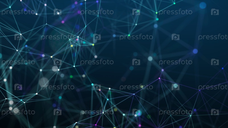 Визуализация больших данных. Понятие сетевого подключения. Абстрактный синий фон с линиями и точками разных цветов. 3D-рендеринг