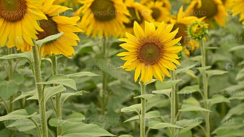 Цветущие желтые подсолнухи растут в сельскохозяйственном поле