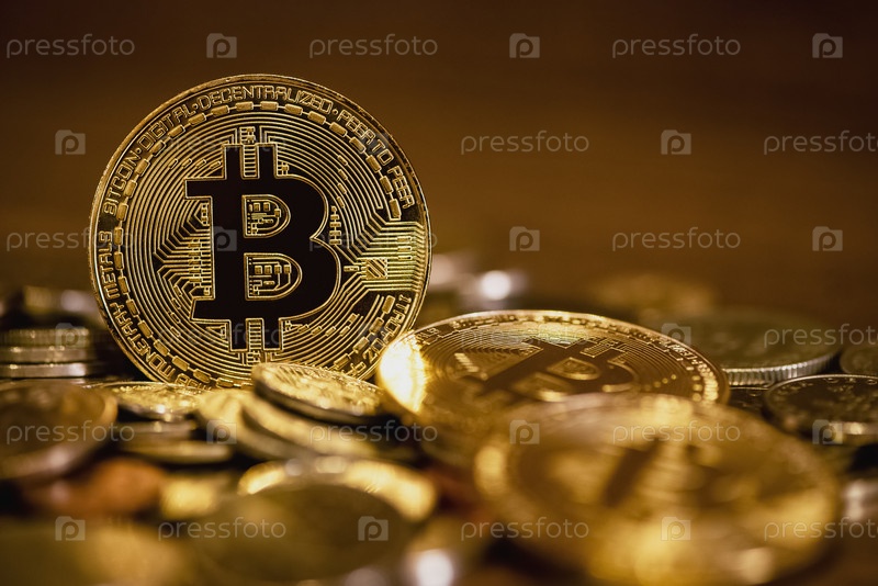 Золотая символическая монета криптовалюты биткойн среди разбросанных металлических монет