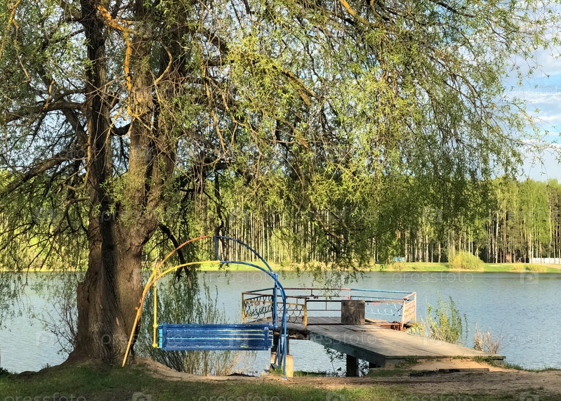 Старые качели и деревянный пирс под большим деревом над водой озера с лесом на горизонте на берегу озера