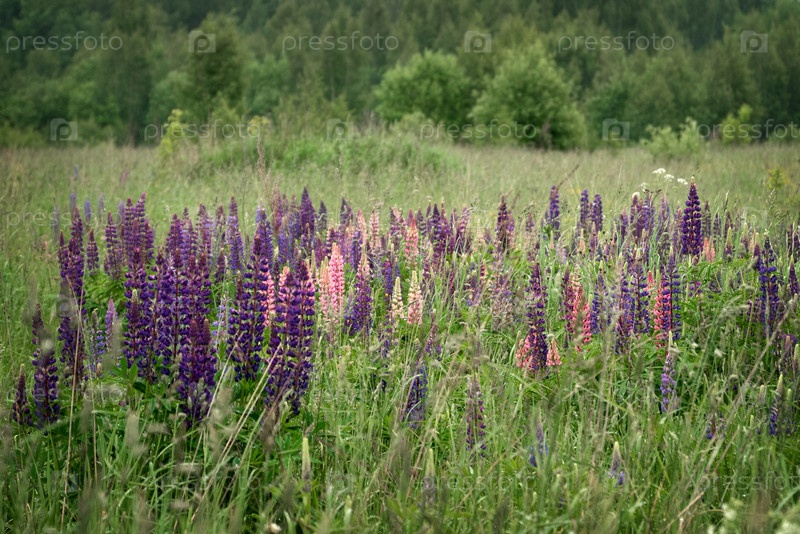 Красочные цветы люпина цветут среди зеленой травы в поле, летний пейзаж