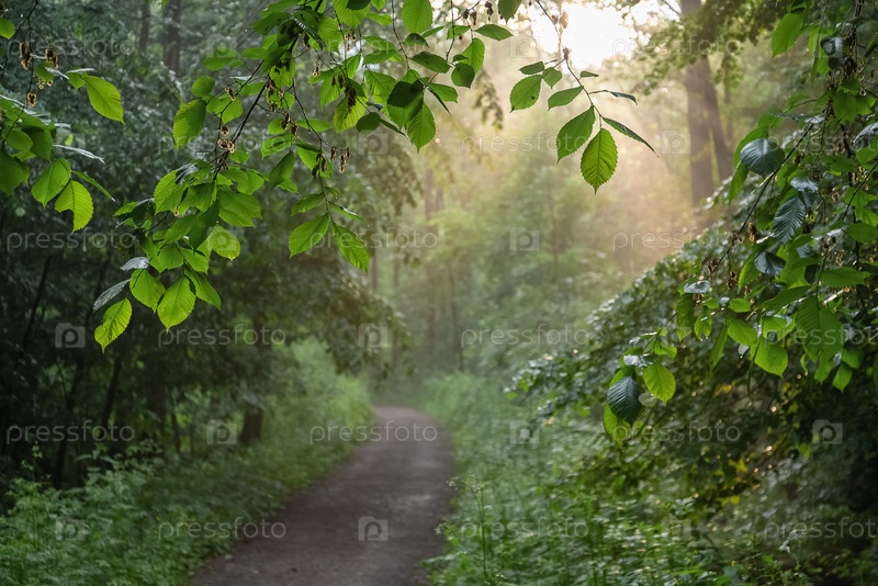 Солнечные лучи сияют сквозь листья деревьев в парке, освещая грунтовую дорогу, летний пейзаж