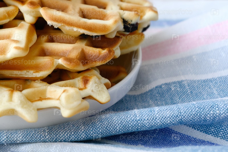 Стопка свежеиспеченных горячих вафель на кухонном полотенце