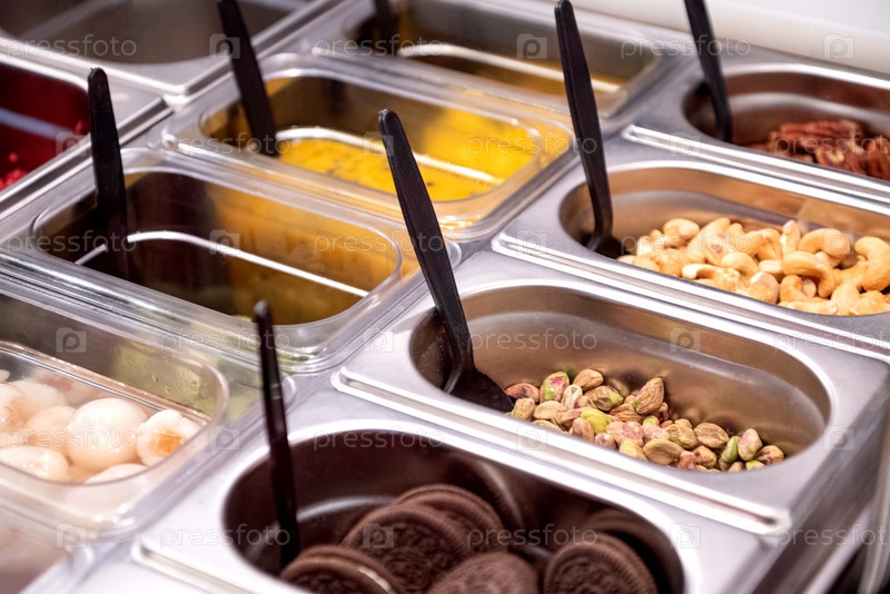 Ряды свежих ингредиентов в металлических мисках с фисташками, орехами, печеньем и джемом для приготовления мороженого