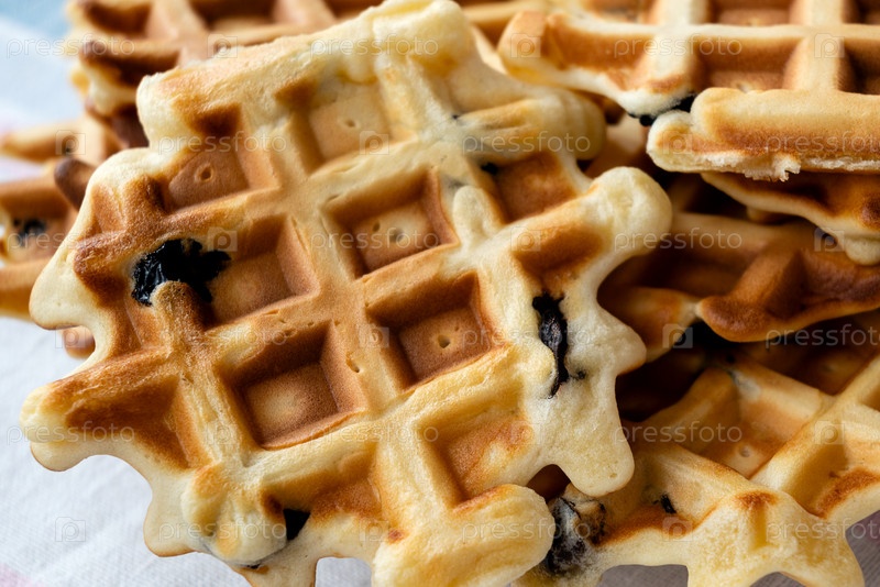 Свежие запеченные домашние вафли на клетчатом текстурированном фоне. Нездоровая еда, уличная еда