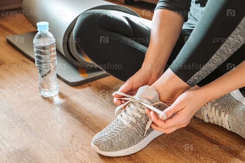 Женщина сидит на полу рядом с скрученным ковриком и завязывает кроссовки, готовясь к занятиям йогой