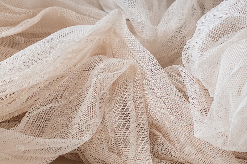 Крупный план текстуры мятой тюлевой ткани цвета слоновой кости, фон