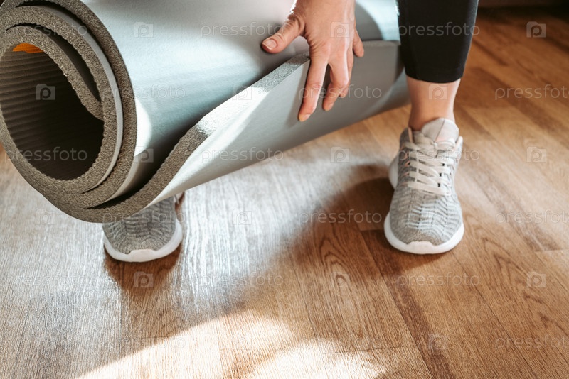 Женщина держит коврик для йоги, готовясь к домашнему фитнесу, спорту, концепции активного образа жизни