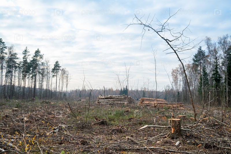 Упавшие стволы деревьев и пни в месте вырубки леса