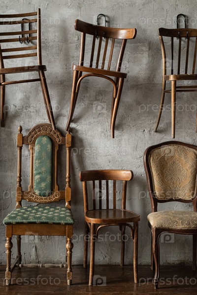 Ряды старых деревянных старинных стульев вдоль стены