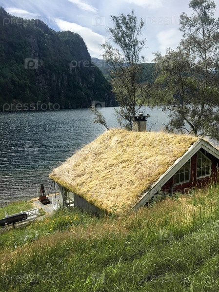 Красные деревянные дома с травяной крышей в скандинавском стиле на берегу озера