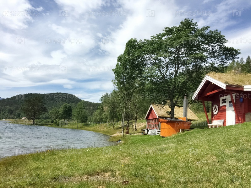 Красные деревянные дома с травяной крышей в скандинавском стиле на берегу озера