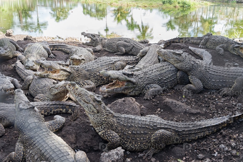 Стая крокодилов на крокодиловой ферме