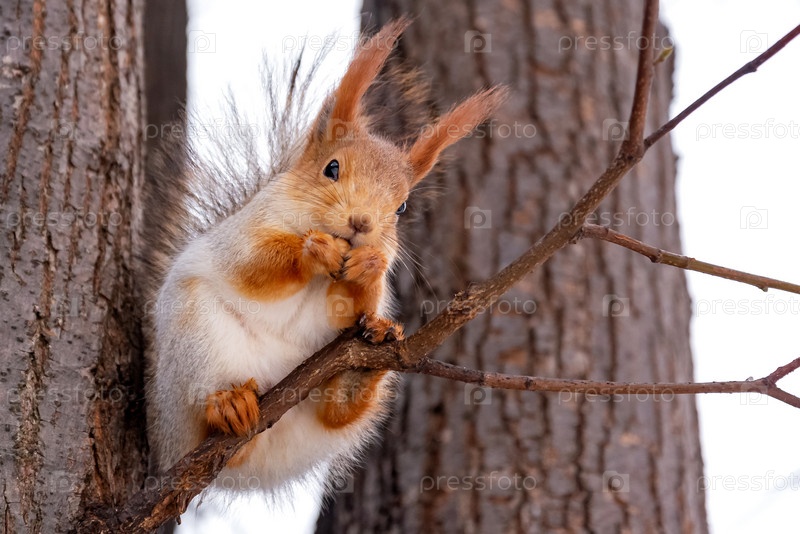 Милая белка ест орех в зимнем парке