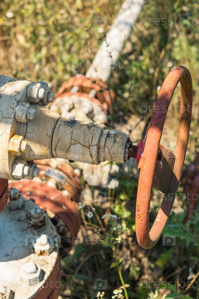 Старые трубы с клапанами с облупившейся краской, оставленные в поле после добычи нефти. Загрязнение окружающей среды