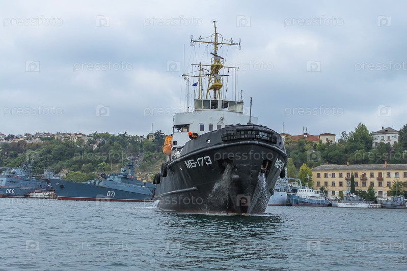 Черный боевой корабль Черноморского флота России на фоне других кораблей в порту Севастополя