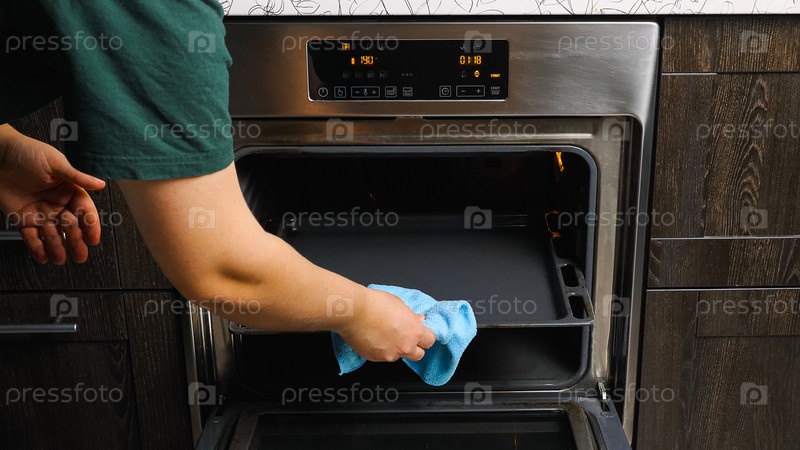 Женская рука открывает дверцу духовки и достает поднос. Подготовка к выпечке блюда