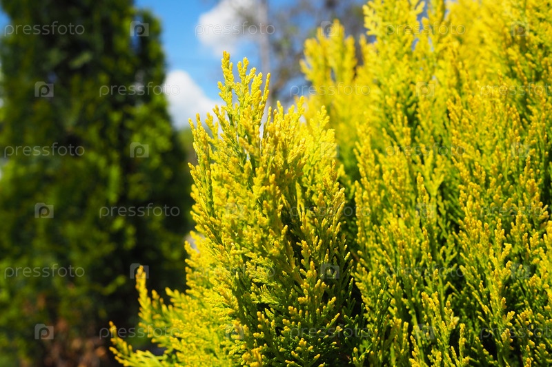 Ветви туи. Зеленые и желтые иглы. Туя — род голосеменных хвойных растений семейства Кипарисовые семейства Кипарисовые. Виды этого рода, используемые в садоводстве как декоративное растение