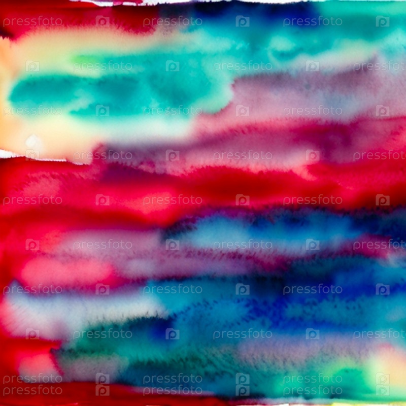 Абстрактный акварельный фон. Акварельные мазки на фактурной плотной бумаге для рисования. Краска красно-зелено-голубая индиго-розовая, разбавленная водой