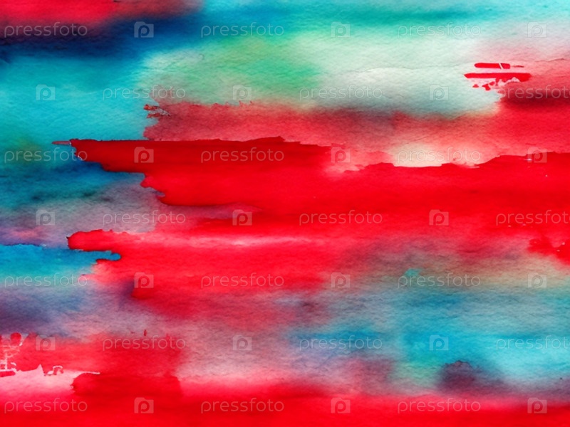 Абстрактный акварельный фон. Акварельные мазки на фактурной плотной бумаге для рисования. Красно-зелено-синяя краска, разбавленная водой