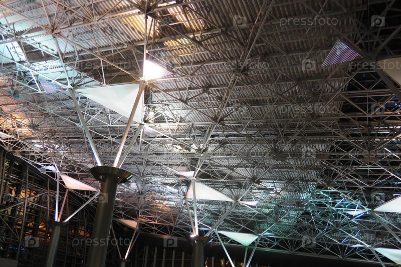 Металлоконструкции под потолком. Декоративные детали потолка аэропорта. Бетонные балки, стеклянные окна и металлические элементы в интерьере общественных зданий. Абстрактная авангардная архитектура