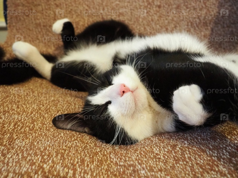 Ленивая черно-белая кошка растянулась на коричневом покрывале или коврике. Молодое животное спит или только что проснулось. Вытянутые ноги и изогнутое тело