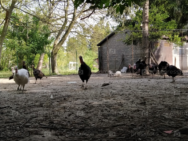 Ферма индейки. Индейки на свободном выгуле в сельском птичнике. Птица на ферме