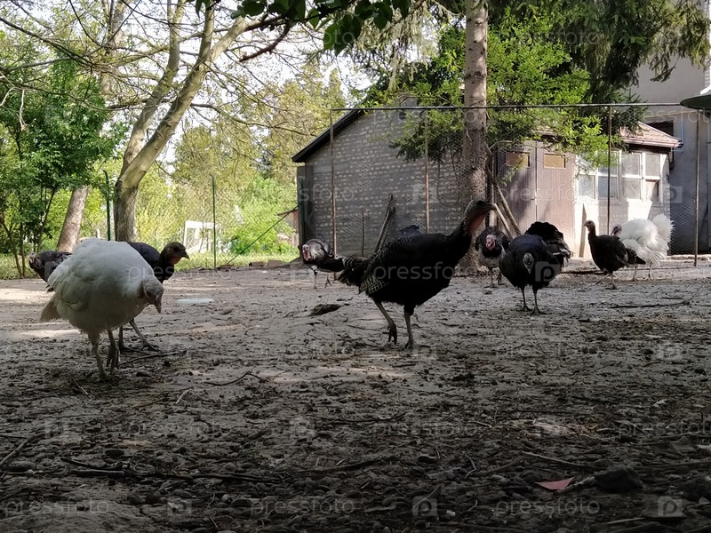 Ферма индейки. Индейки на свободном выгуле в сельском птичнике. Птица на ферме
