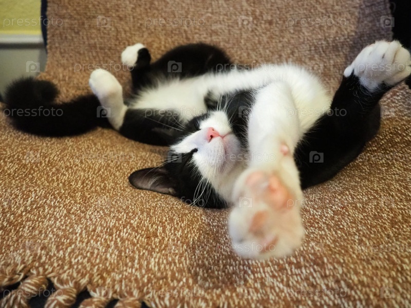 Ленивая черно-белая кошка растянулась на коричневом покрывале или коврике. Молодое животное спит или только что проснулось. Вытянутые ноги и изогнутое тело