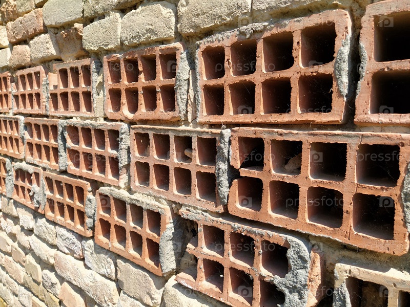 Старый фон полой кирпичной стены. неровная кирпичная стена сбоку. Красный пустотелый кирпич. Свет и тень. Технологии сейсмоопасных регионов. Много пустотелых кирпичей