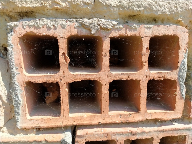 Старый фон полой кирпичной стены. неровная кирпичная стена сбоку. Красный пустотелый кирпич. Свет и тень