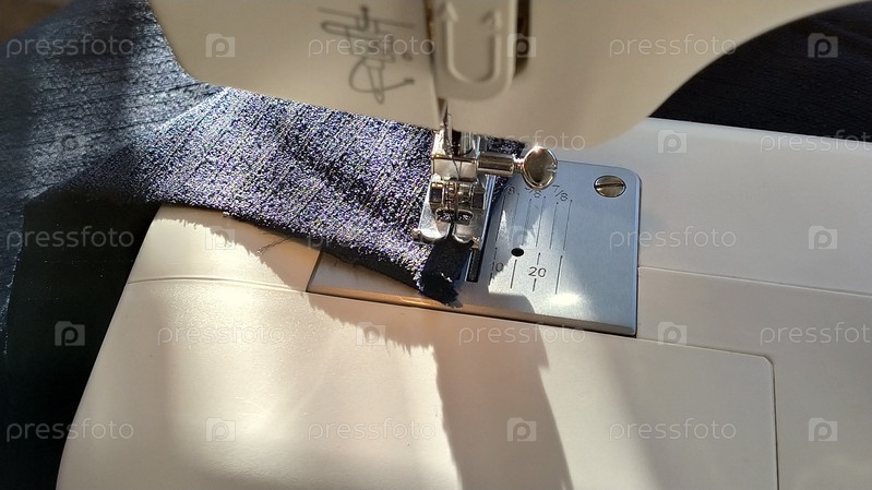 Процесс шитья на современной швейной машине, крупный план. Лапка для швейной машины с иглой. Ткань темно-синего цвета отделана двойным завертыванием края ткани. Естественный солнечный свет