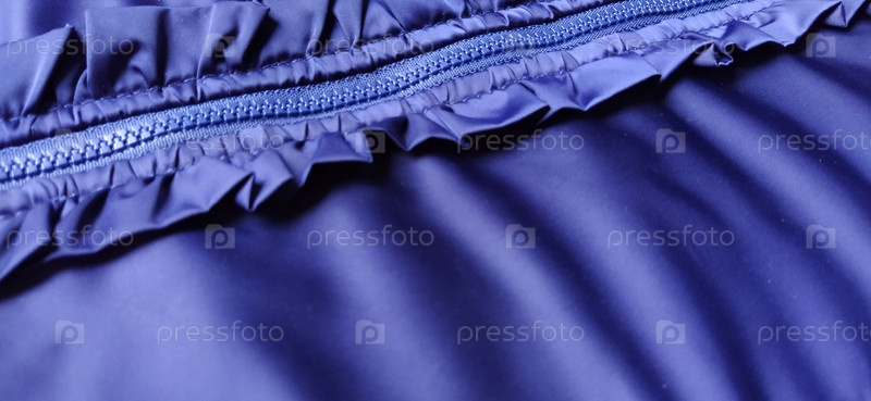 Молния на пуговицах на синем плаще. Волны и складки на ткани. Красивые воланы, рюши, оборки. Декоративная отделка изделия. Присборенная, сшитая шелковая ткань. Хорошая повседневная одежда