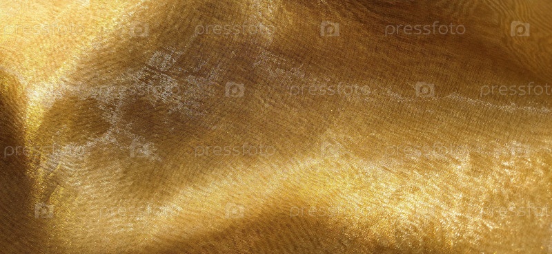 Красивая золотая ткань. Органза желтого, оранжевого, бежевого и коричневого оттенков. Складки на ткани. Блестящий градиент под светом. Сложенный шелковистый тюль. Прозрачный материал штор