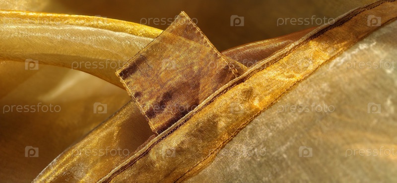 Шторные петли. Красивая золотая ткань. Органза желтого, оранжевого, бежевого и коричневого оттенков. Складки на ткани. Блестящий градиент под светом. Сложенный шелковистый тюль. Прозрачный материал штор
