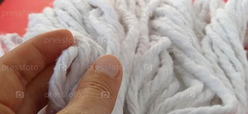 Женская рука касается хлопковых нитей швабры. Выбор швабры для уборки. Работы по уборке дома. Белые веревки. Чистильщики пальчиков