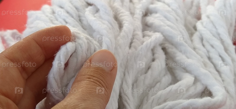Женская рука касается хлопковых нитей швабры. Выбор швабры для уборки. Работы по уборке дома. Белые веревки. Чистка дамских пальчиков