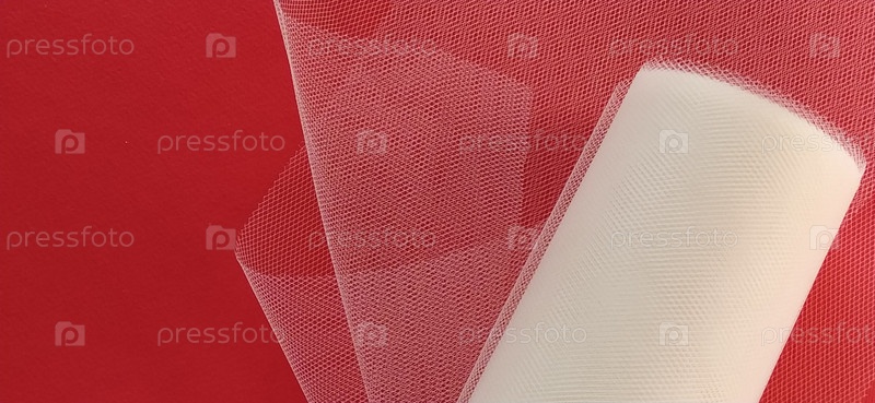 Ткань - белая сетка в рулоне на красном фоне. Нейлоновая лента для завязывания бантиков на волосах. Моток тюлевой ткани. Копировать пространство