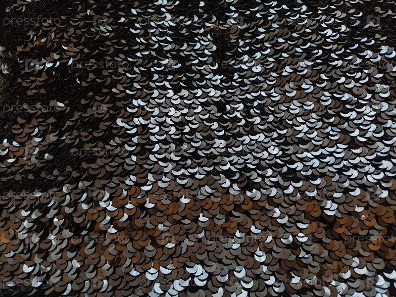 Ткань с пайетками. Черные пайетки с бело-серым блеском. Отражение света на отдельных элементах в хаотичном порядке. Шитье или рождественский декоративный фон
