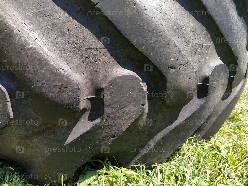 Покрышка от колеса трактора или грузовика. Крупный план черной резины. Повреждения и трещины. Текстура каучука, который производится из натуральных и синтетических каучуков и корда. Кордовая ткань