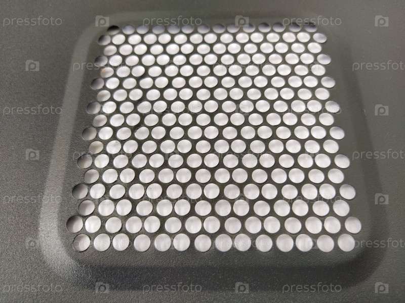 Вентиляционная решетка в комп. Металлическая поверхность с круглыми многочисленными отверстиями
