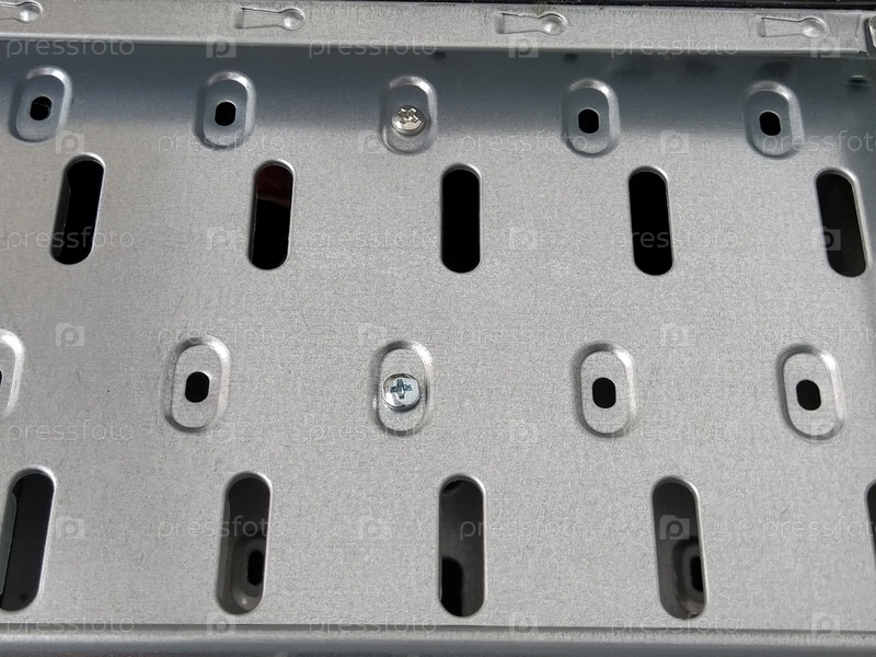 Корпус компьютера крупным планом. Металлическая поверхность с вентиляционными отверстиями. Места для крепления шурупами. Металл серебристого цвета. Деталь компьютера