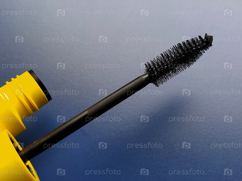 Тушь со снятой щеточкой. Желтый пластиковый футляр от туши. Кисть с черной краской. Макияж глаз. Тема косметики на синем фоне. Косметический продукт для красоты глаз