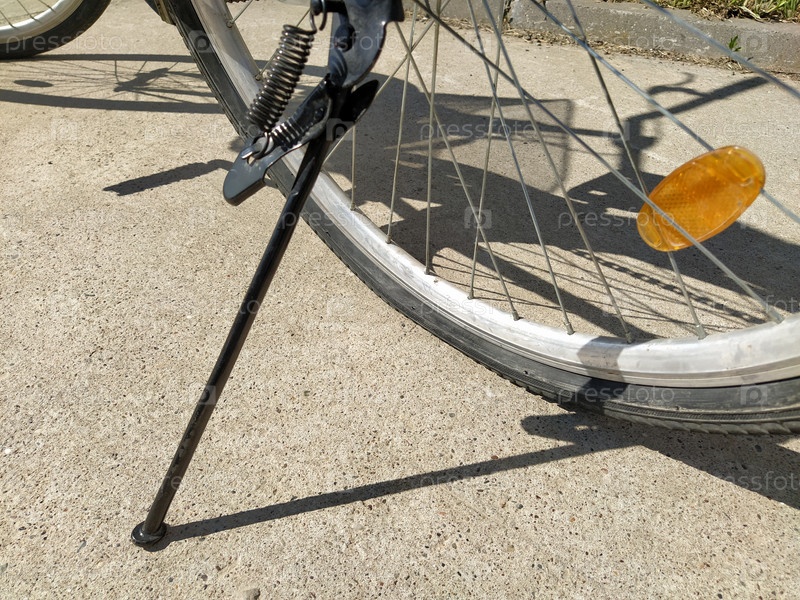 Спущенная шина на велосипеде. Велосипед стоит на подножке. Спущенная шина врезалась в асфальт. Дырка в резиновой шине. Рефлекторное колесо